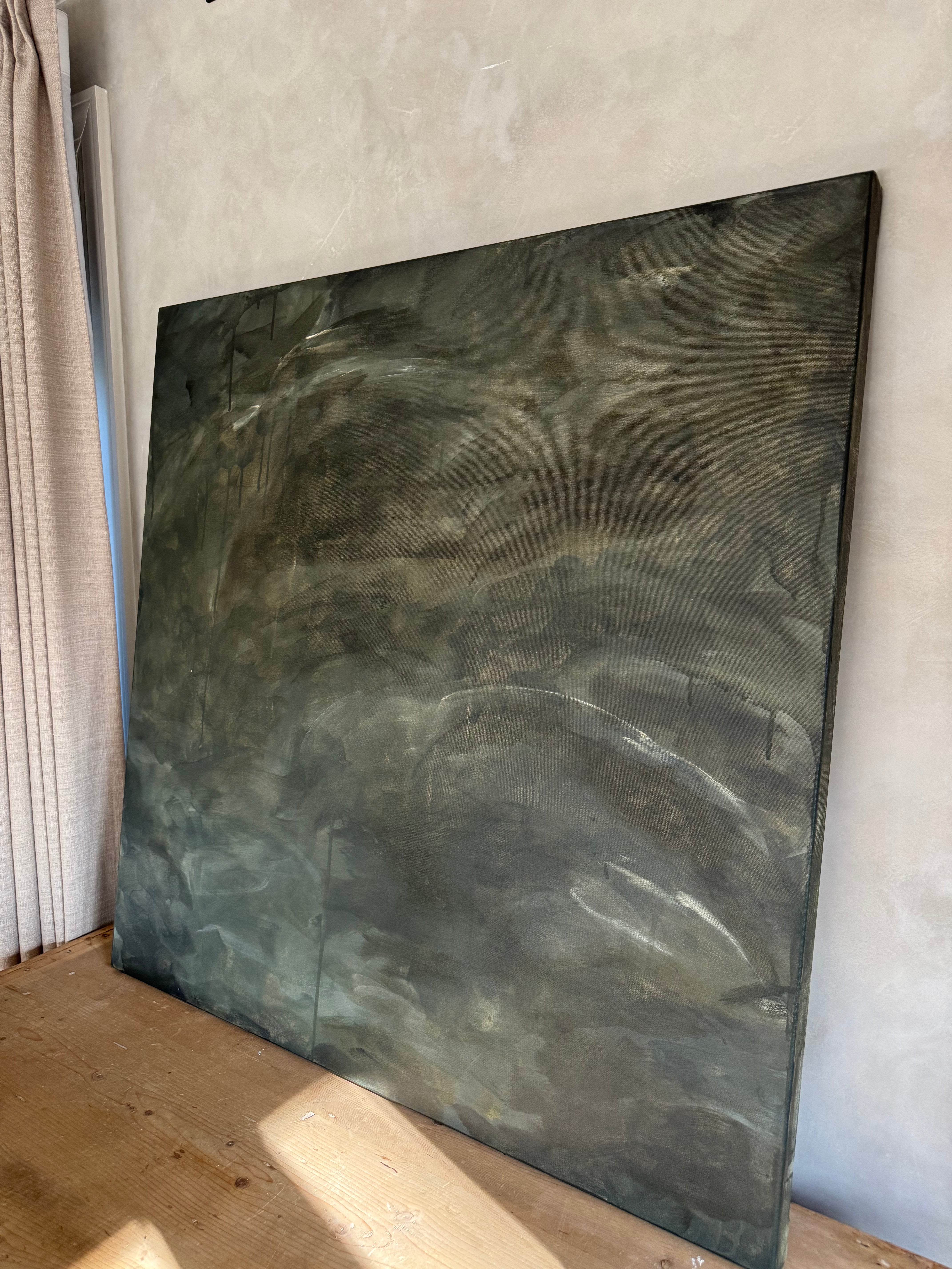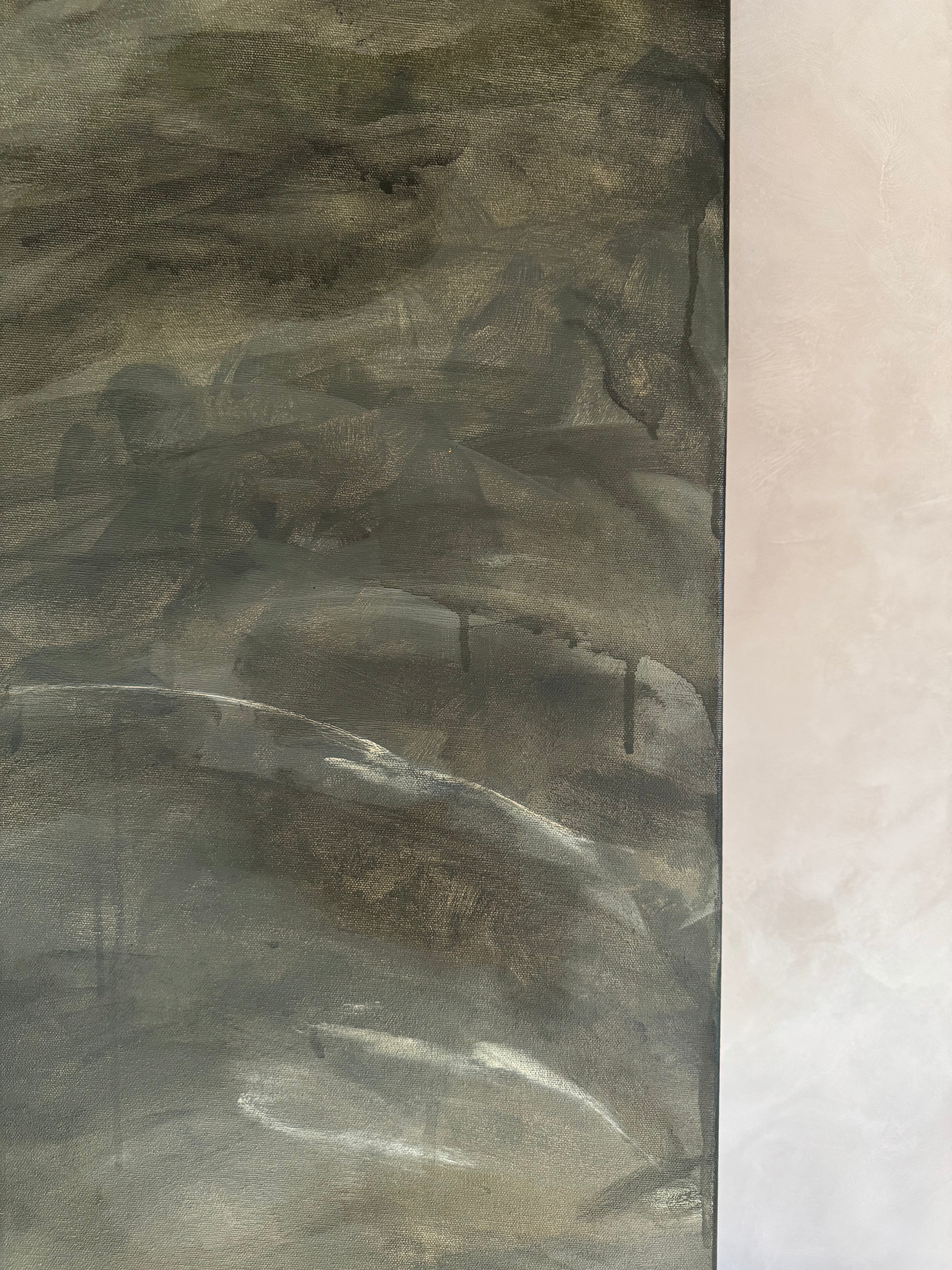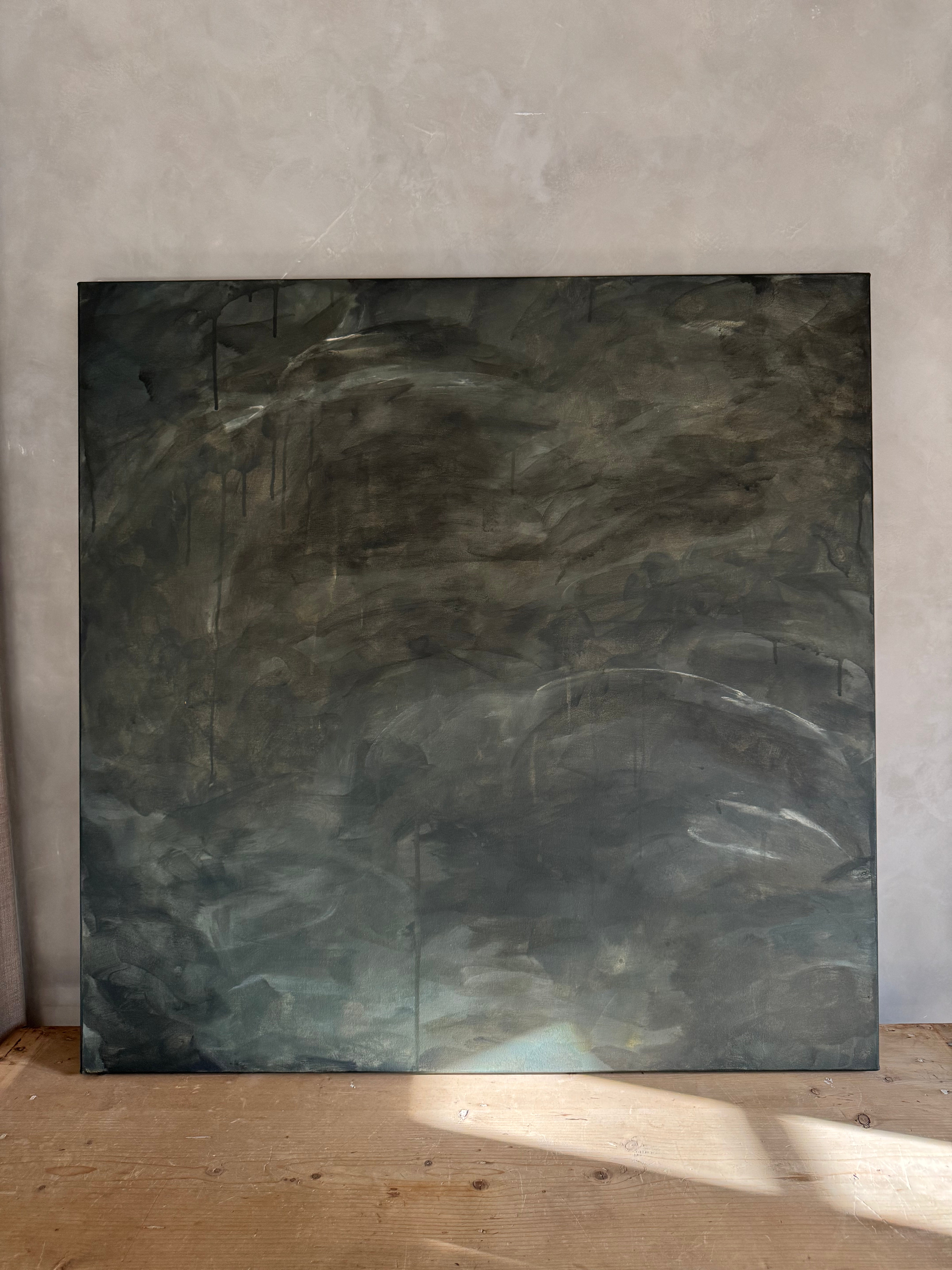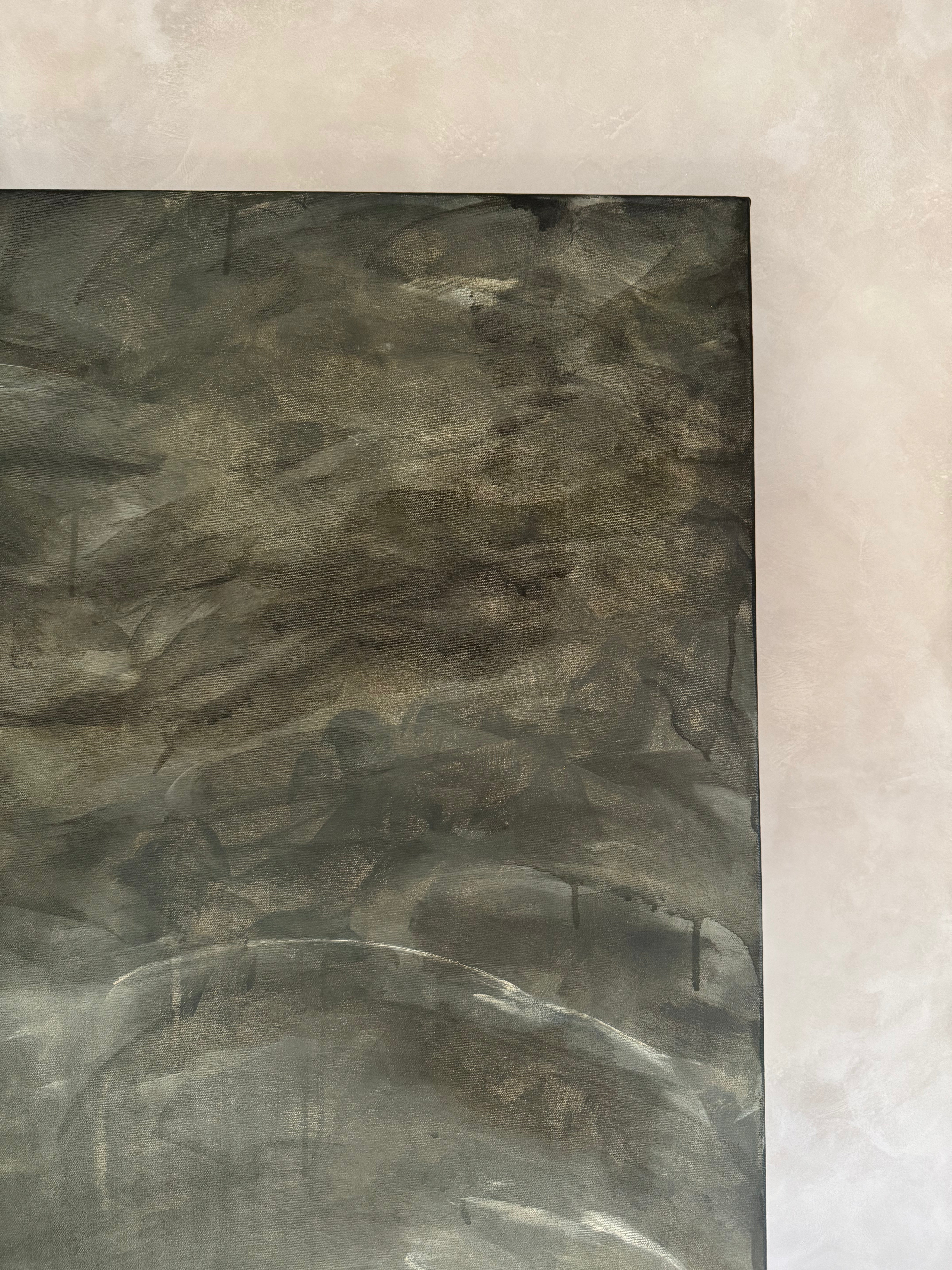 Becoming is a study in quiet transformation. Layered deep greens move in and out of shadow, creating a sense of grounding and gentle momentum. The piece explores the moment emotion shifts into form—not sudden, but unfolding, textured, and alive. Its square composition holds a stillness, while the movement within suggests growth, emergence, and the feeling of coming into one’s own