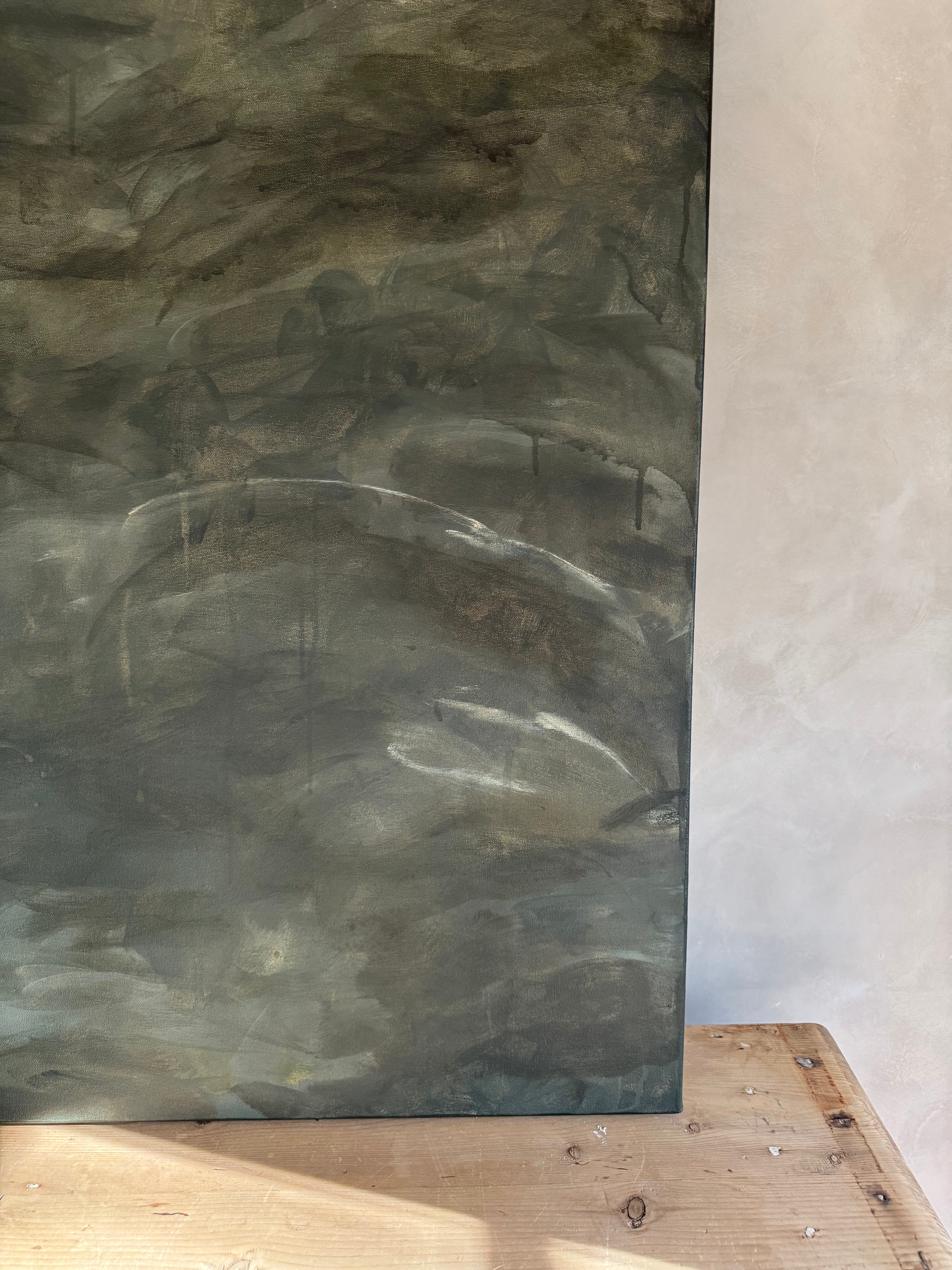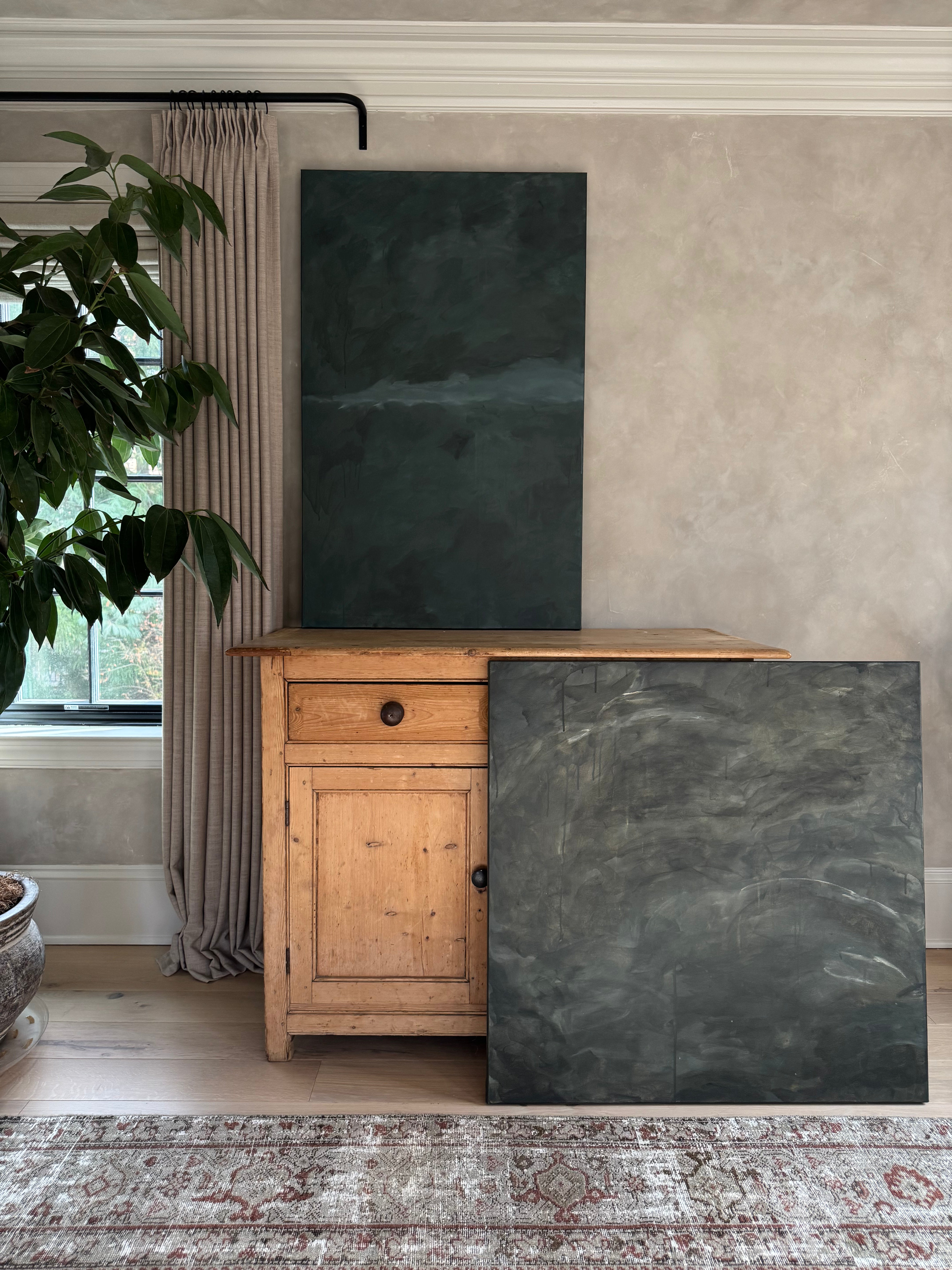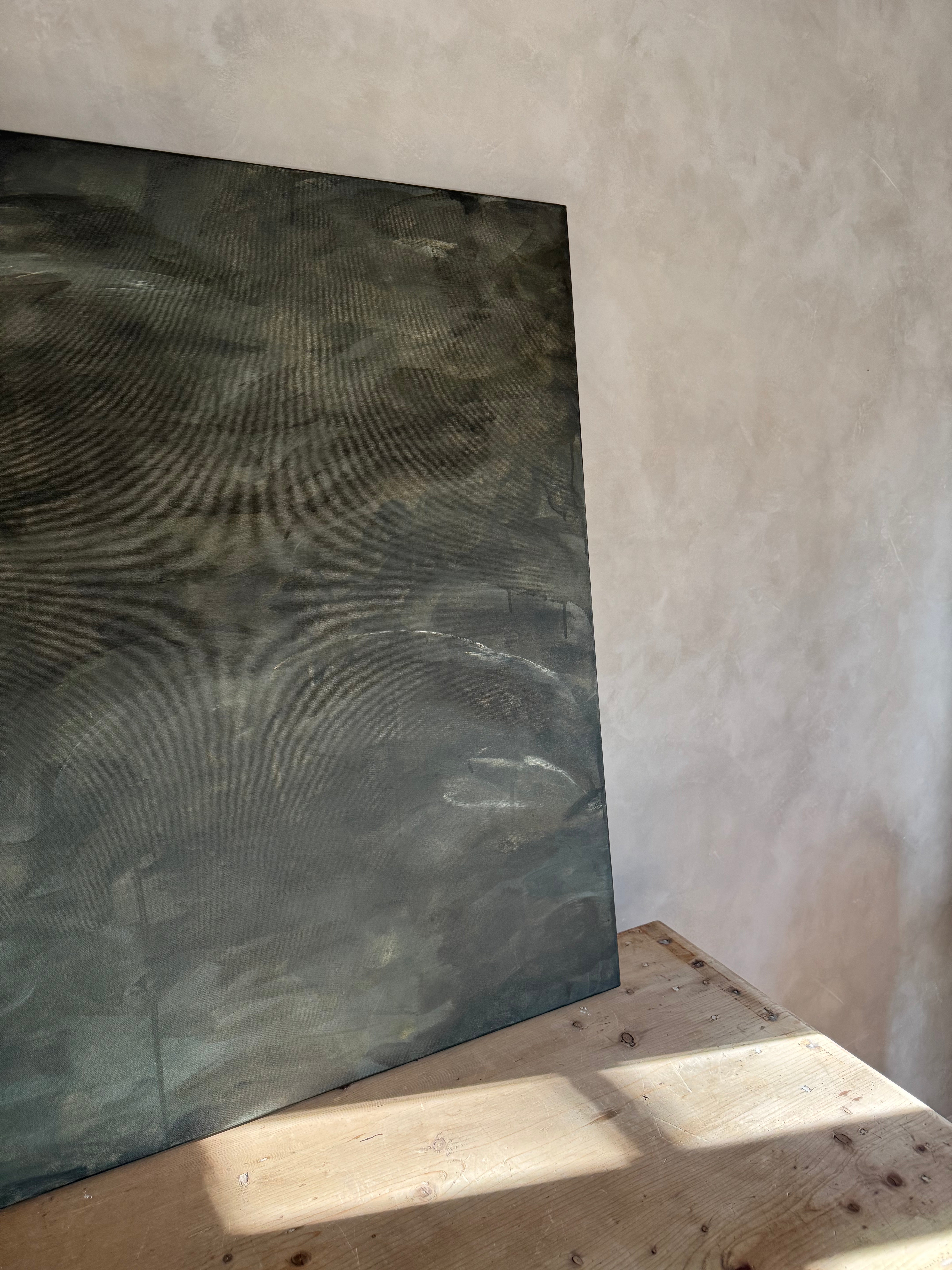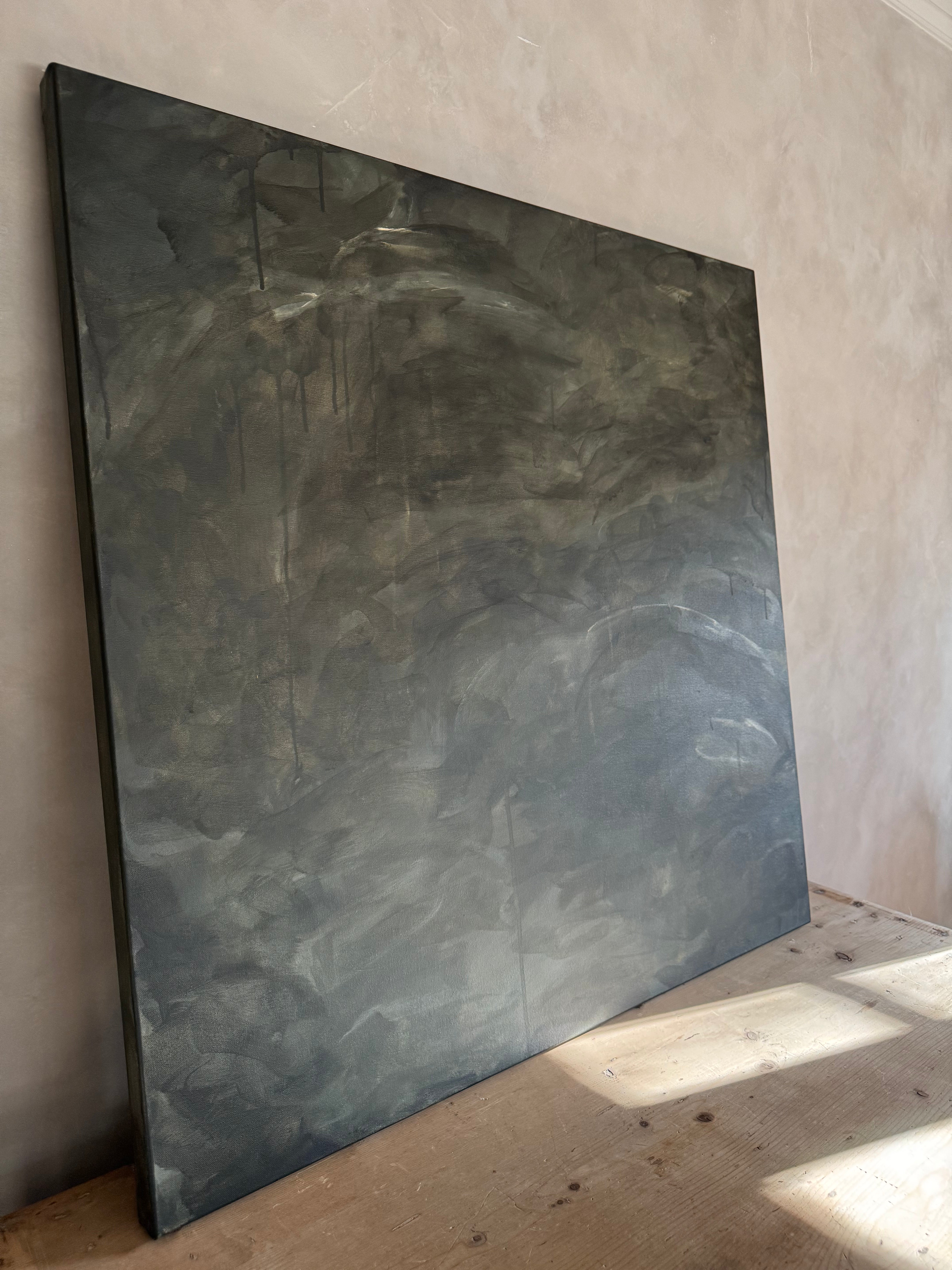 Becoming is a study in quiet transformation. Layered deep greens move in and out of shadow, creating a sense of grounding and gentle momentum. The piece explores the moment emotion shifts into form—not sudden, but unfolding, textured, and alive. Its square composition holds a stillness, while the movement within suggests growth, emergence, and the feeling of coming into one’s own
