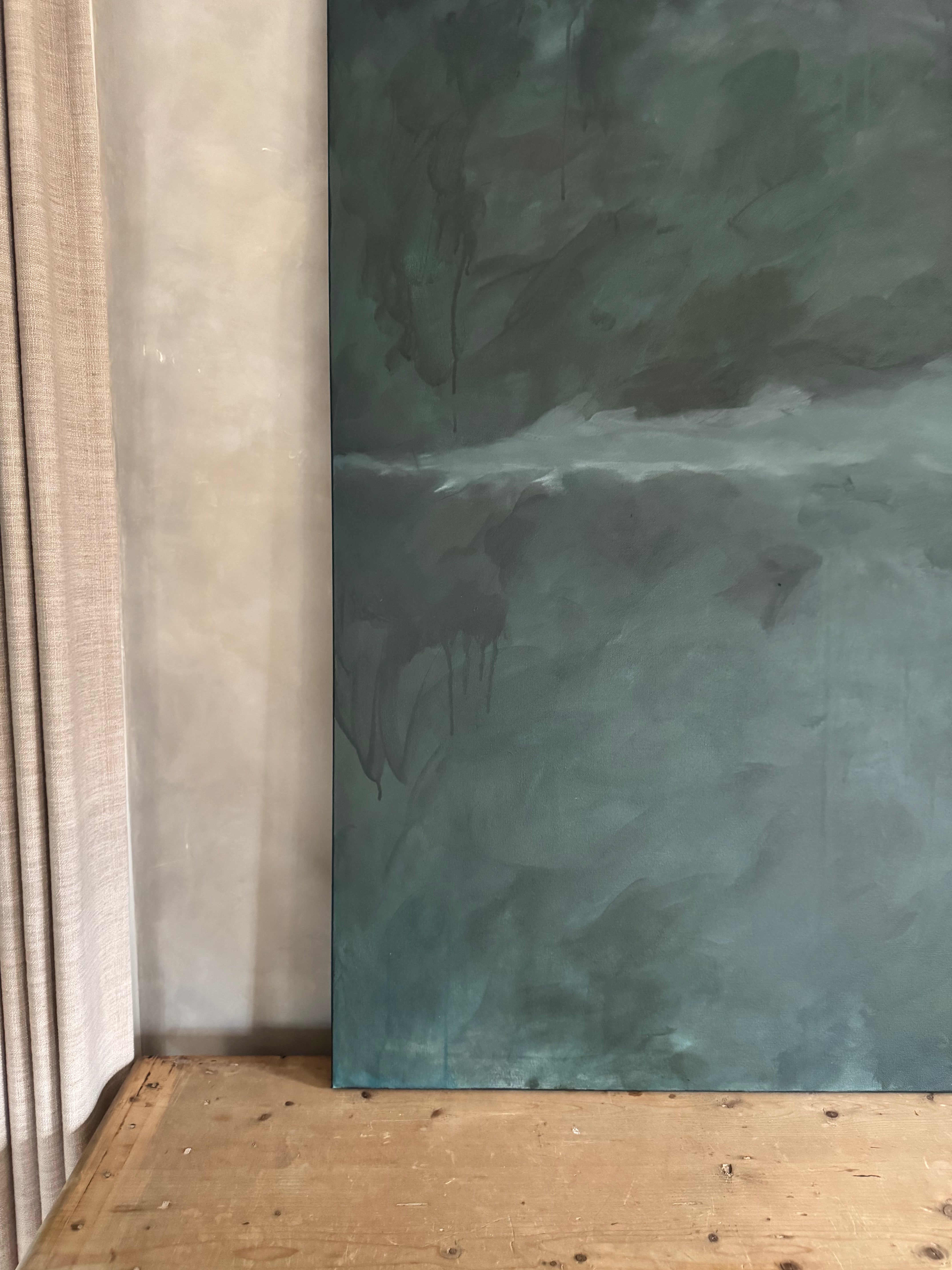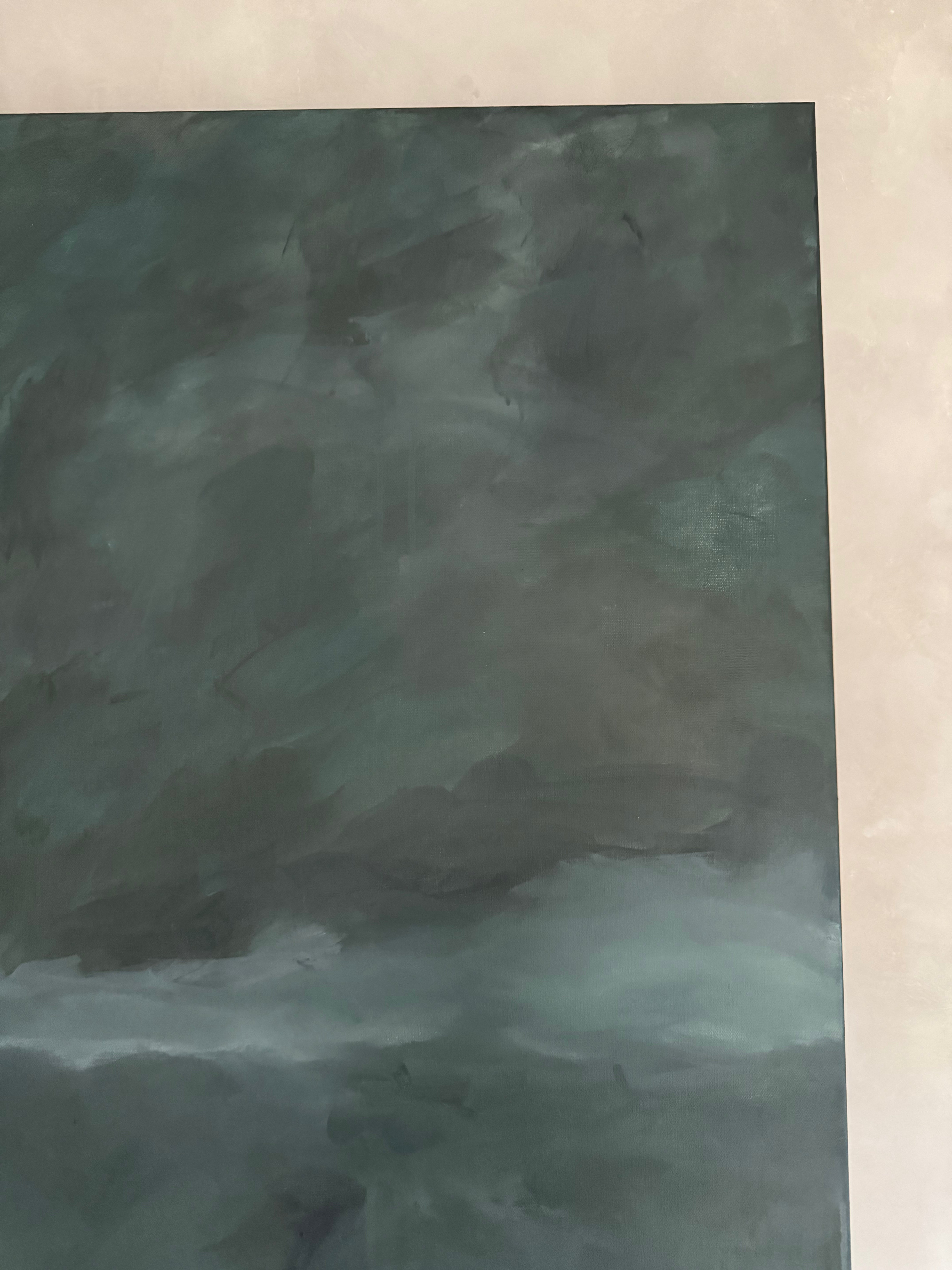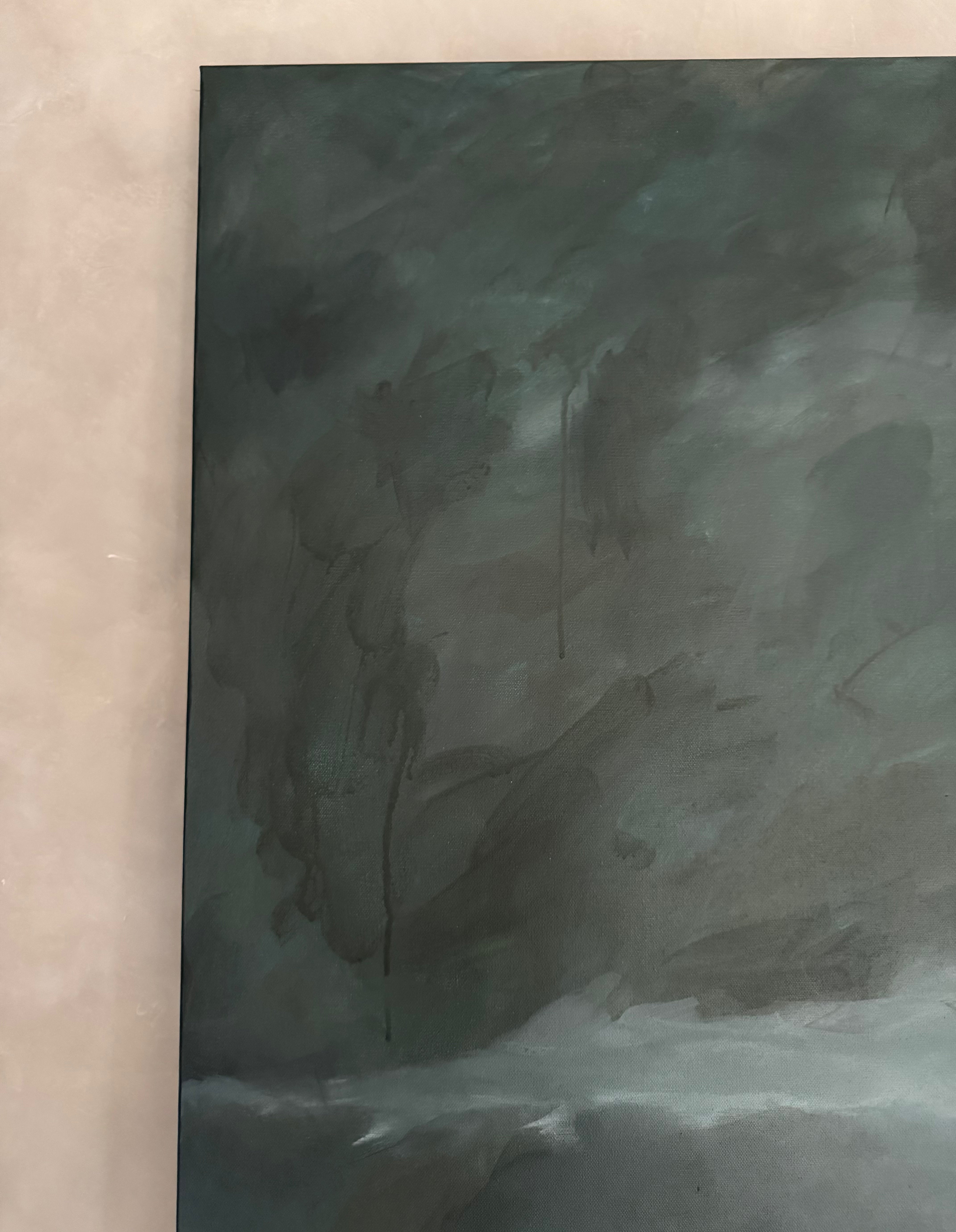 Beneath the Surface invites the viewer into a quiet, immersive depth. Rich blue/green tones drift across the canvas, revealing subtle movements, layered shadows, and moments of softened light. The piece hints at emotion and memory resting just beyond what’s immediately visible—an exploration of what lies underneath, both seen and felt. Its elongated scale enhances the sense of being gently pulled inward, creating a work that is both expansive and intimate