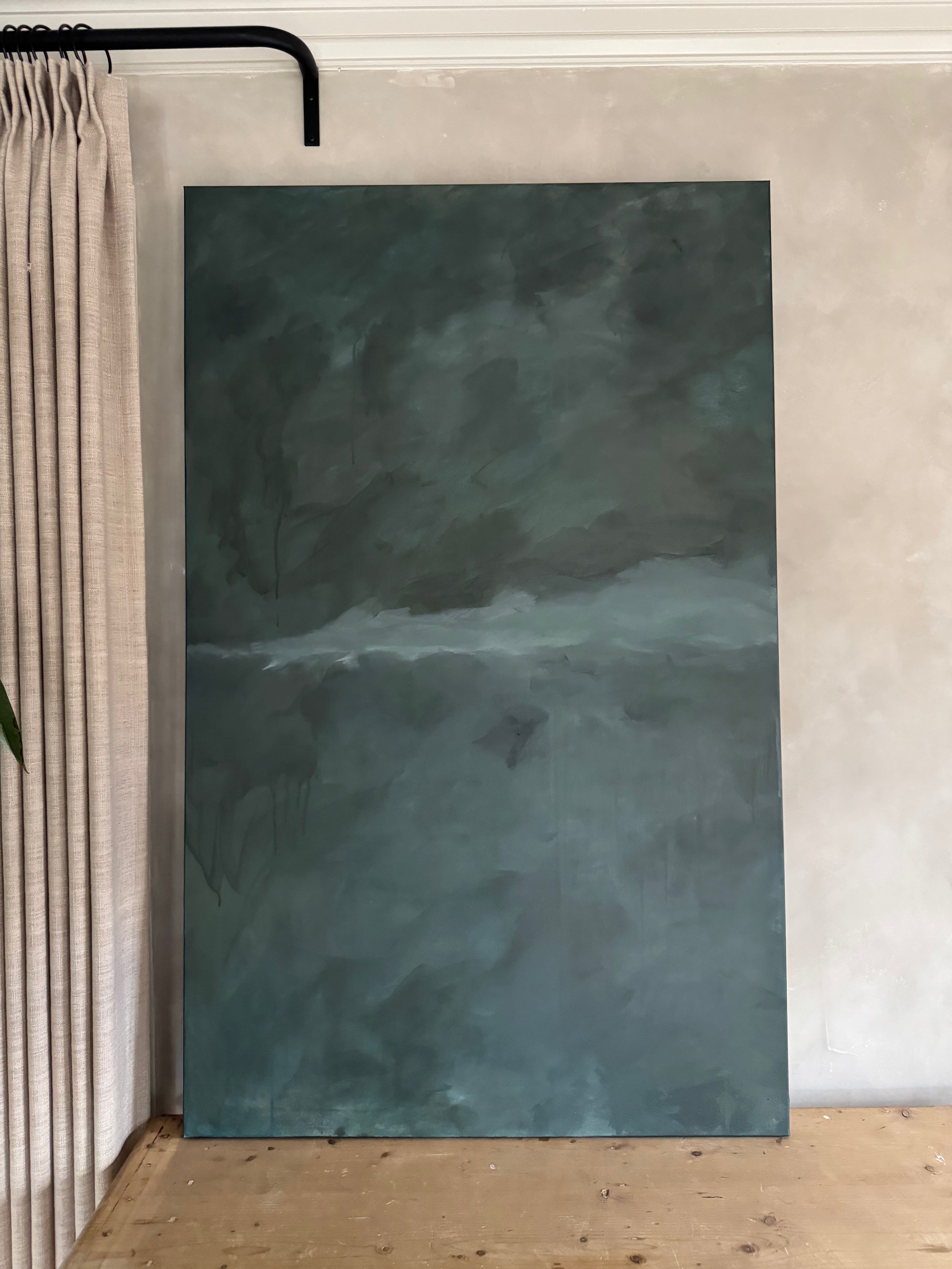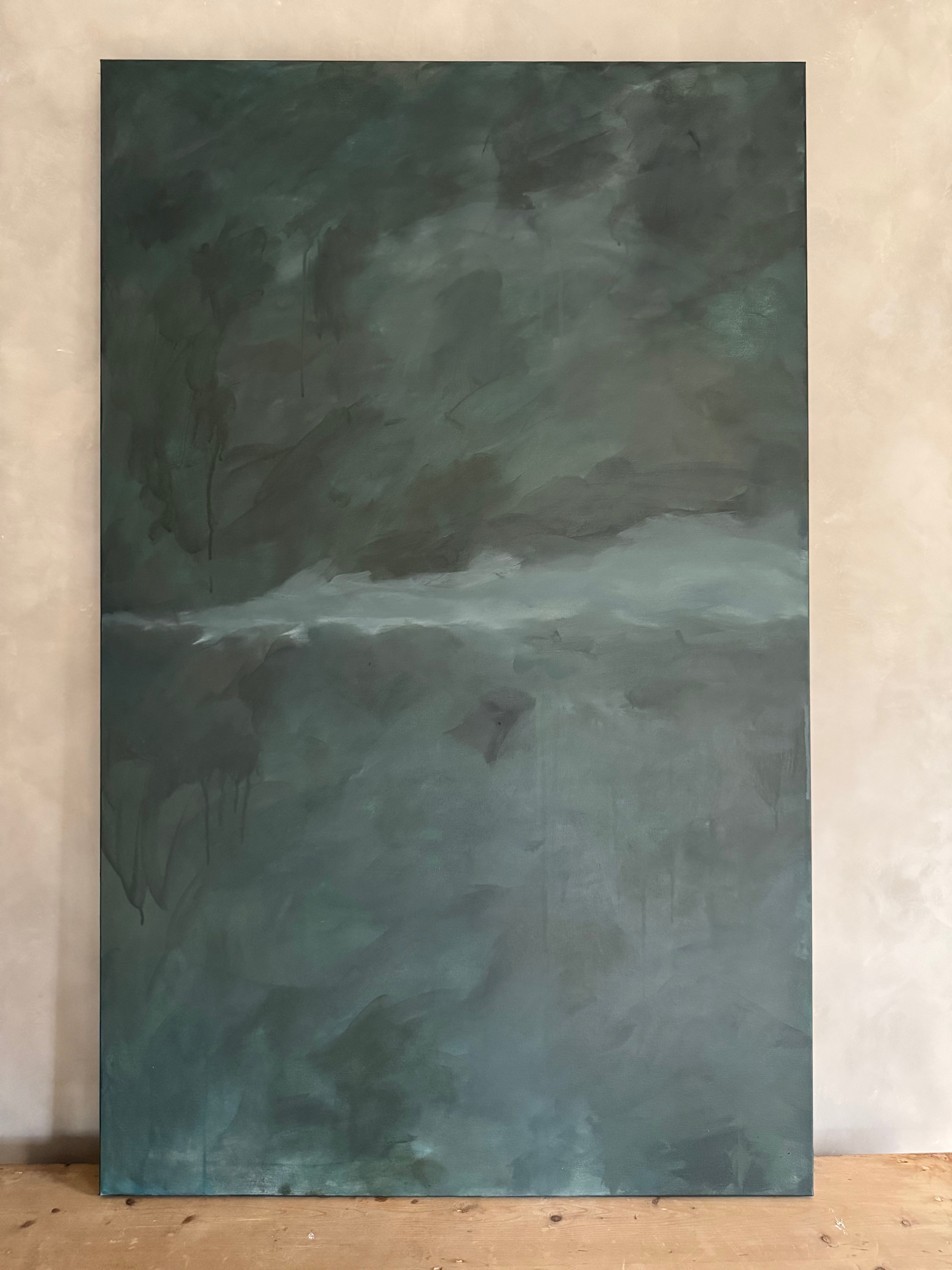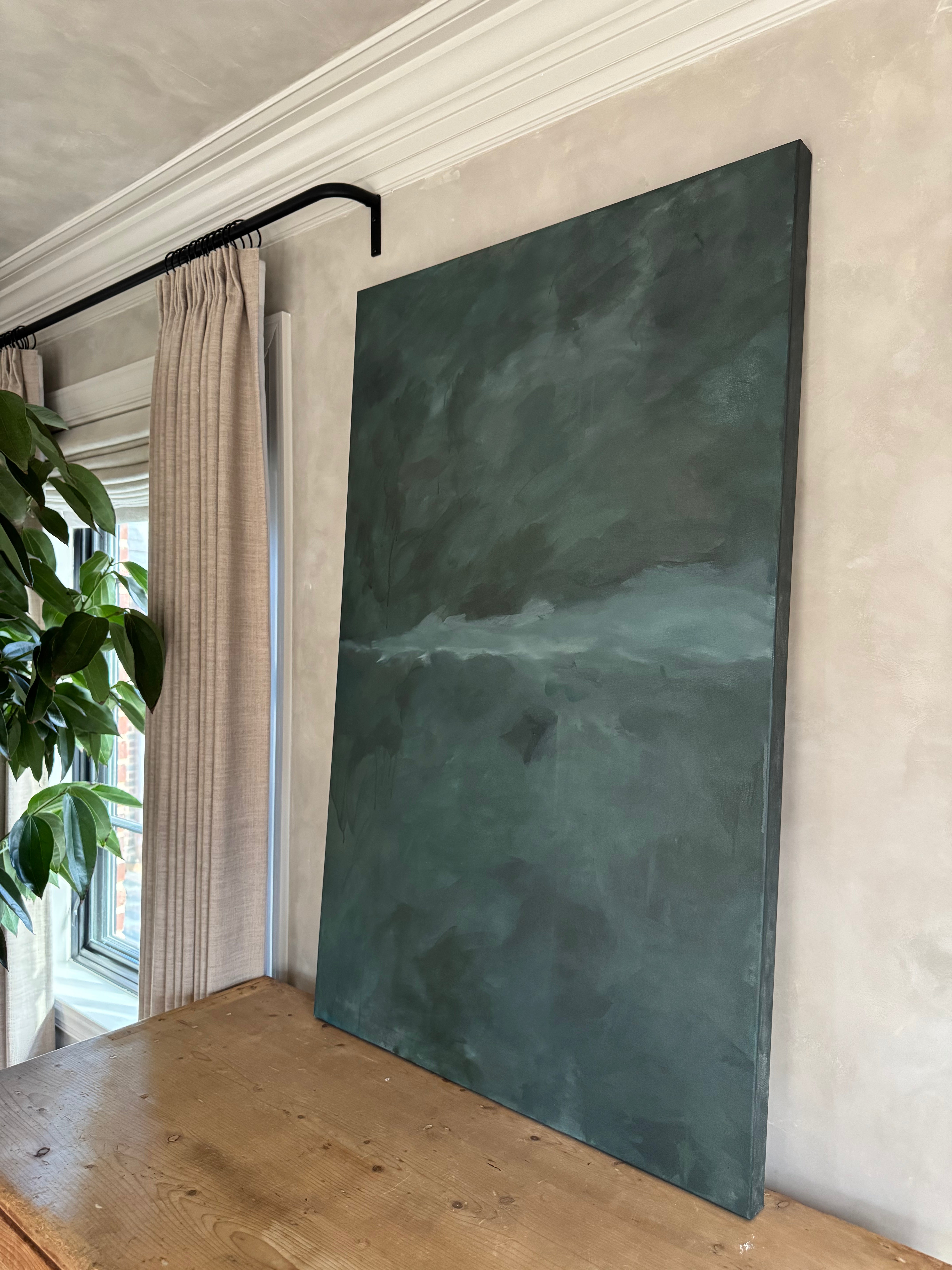 Beneath the Surface invites the viewer into a quiet, immersive depth. Rich blue/green tones drift across the canvas, revealing subtle movements, layered shadows, and moments of softened light. The piece hints at emotion and memory resting just beyond what’s immediately visible—an exploration of what lies underneath, both seen and felt. Its elongated scale enhances the sense of being gently pulled inward, creating a work that is both expansive and intimate